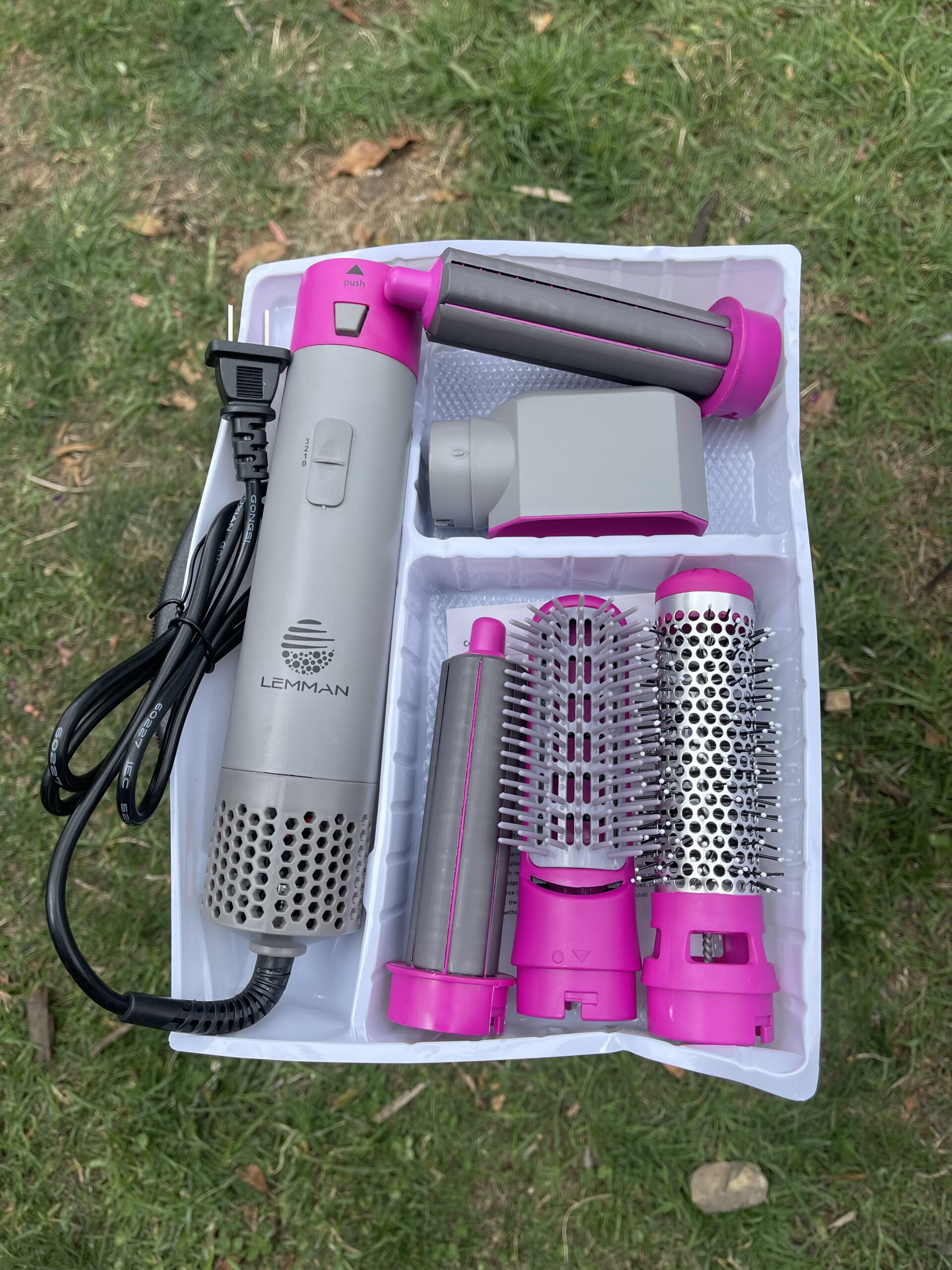 Trae 1 tubo principal, 2 cabezales rizadores, 1 cepillo, 1 peine caliente, 1 boquilla de secado y 1 manual de usuario. Con un solo equipo puedes secar, alisar y rizar sin cambiar de herramienta.