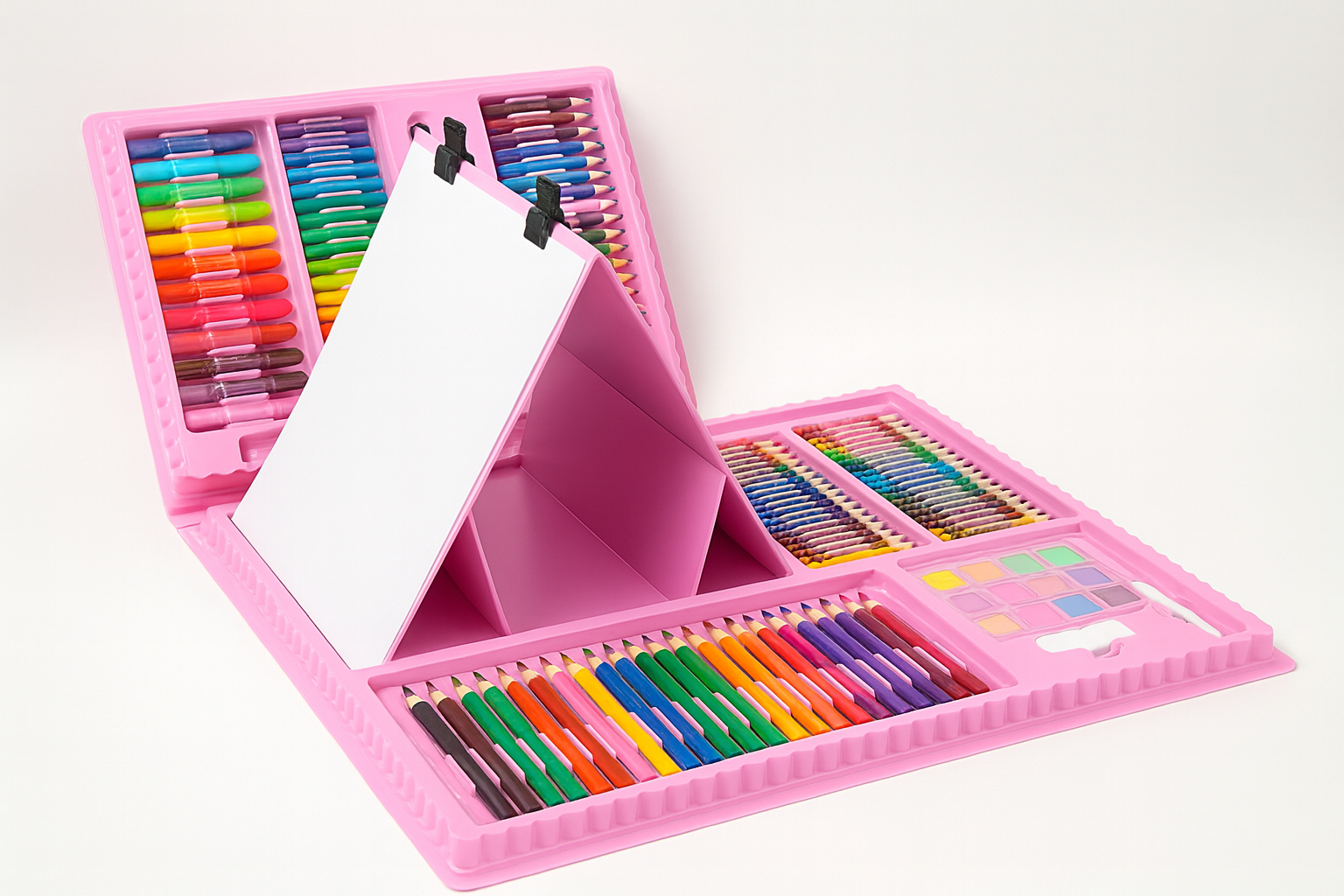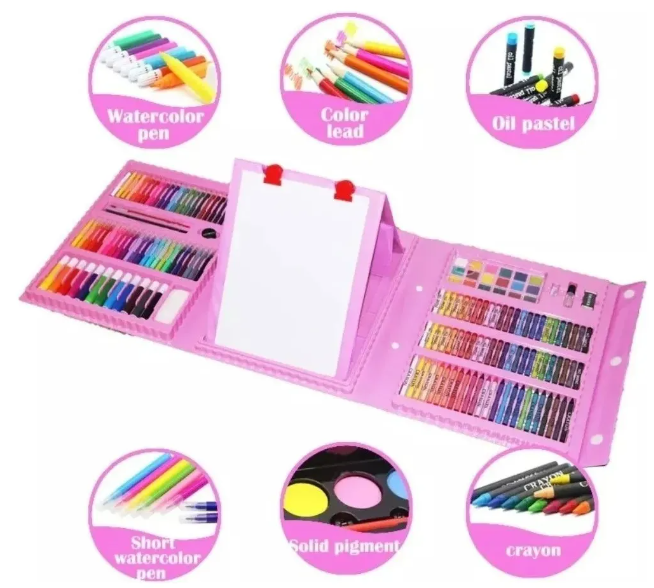 Un set completo de 208 piezas: crayones, marcadores, lápices de colores, acuarelas, pinceles, borradores, sacapuntas y más. Todo lo que necesitas para dibujar, colorear y pintar en un solo estuche.